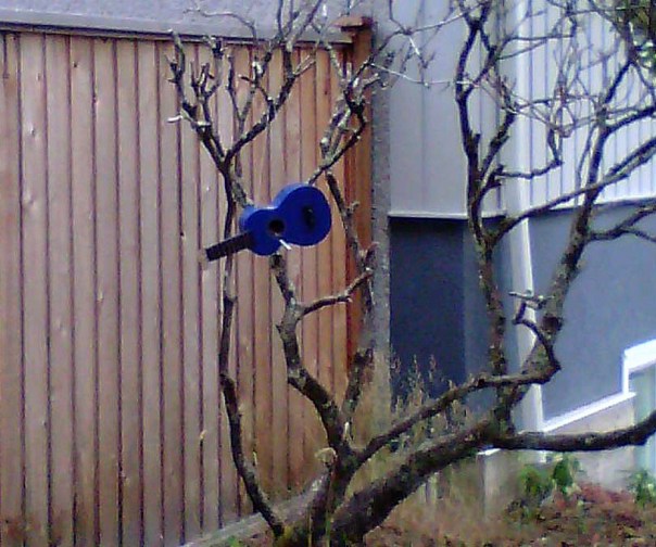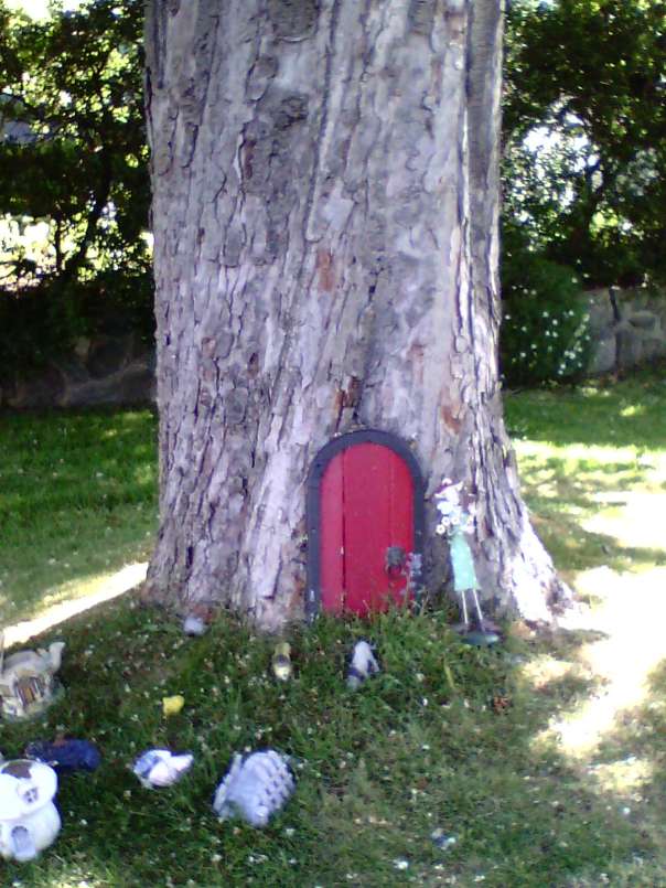 A fairy door at the base of an old oak tree and a banjo birdhouse is not a normal sight to see.