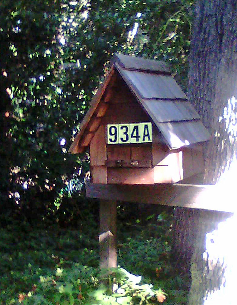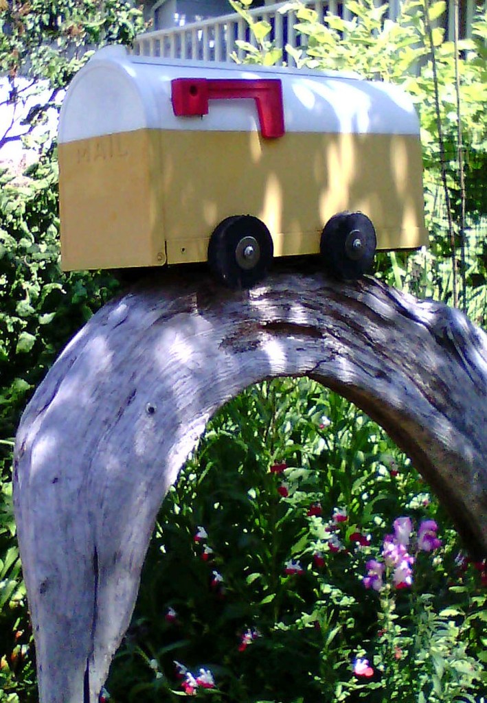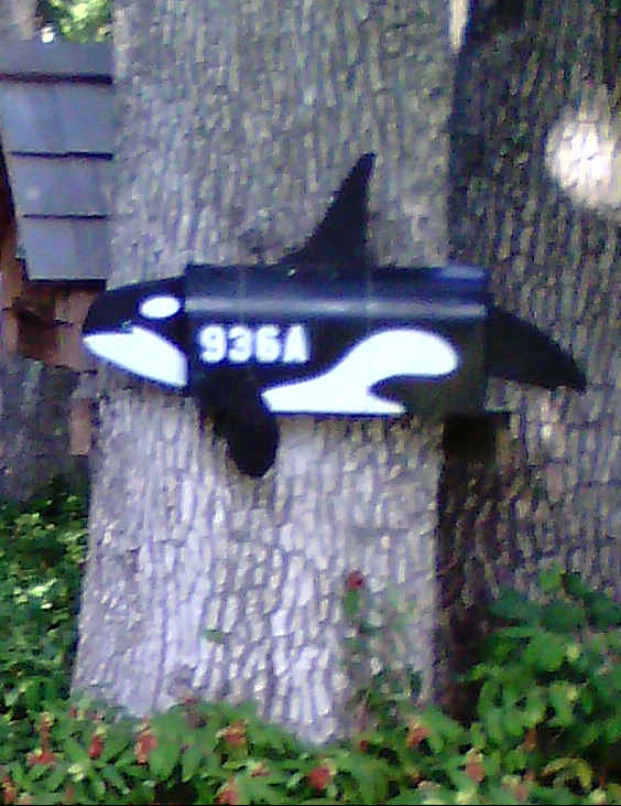 I’m often fortunate in meeting people who have a story behind their piece of sculpture or unusual mailbox that makes a home among their trees and flowers. The miniature yellow volkswagon mailbox reminds the owners of the many happy family times that transported them to campsites and holiday destinations. The mini-house and orca whale mailboxes differentiate two houses on a steep lane—one behind the other.