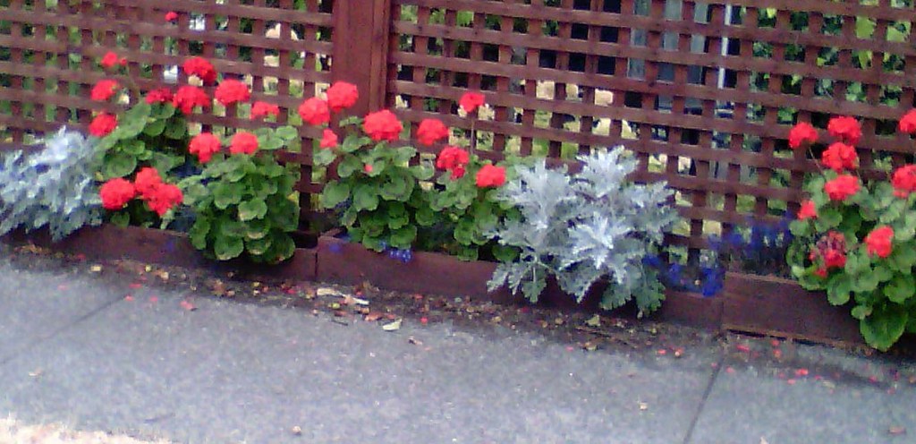 Splashes of brightly coloured geraniums against this fence, interspersed with bits of tiny blue flowers, grabbed my attention each time I pass. . . .