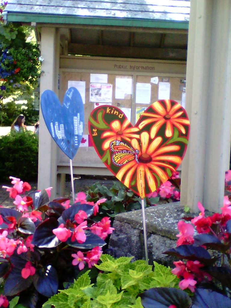 Strolling through the Village, the Oak Bay Artists have each contributed their version of the Covid Hearts to liven up the planters and boulevards. Here are two examples:
