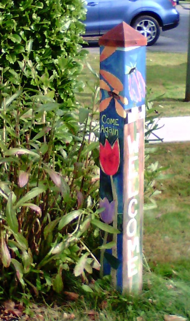 An artistic “Welcome” and “Farewell” at the foot of a homeowner’s entrance to his home.